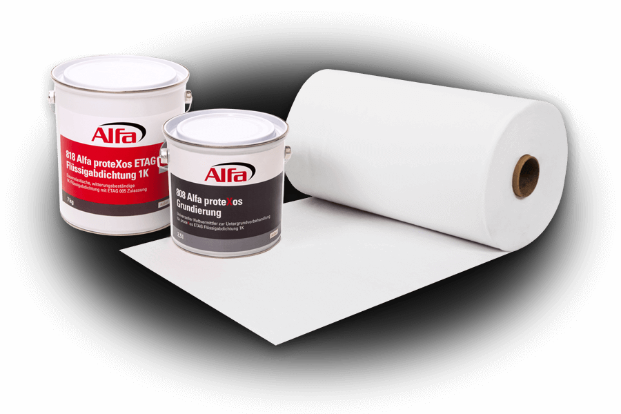 Anschließend ist auf bestimmten Untergründen die verarbeitungsfertige 808 Alfa proteXos Grundierung aufzutragen. Bitumenbahnen u.v.m. müssen nicht grundiert werden.